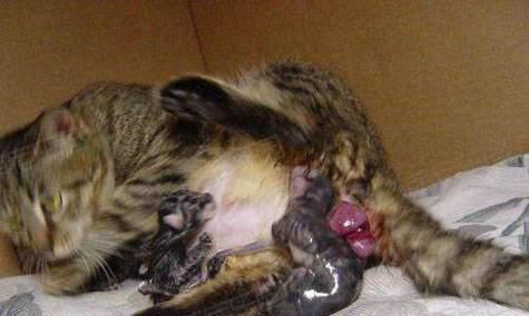 母猫应该用牙齿轻轻地咬住脐带,然后用力将其断开。