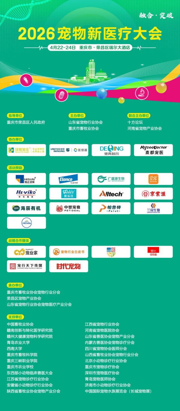 4月22-24日,由重庆市荣昌区人民政府指导,山东省宠物行业协会、重庆市畜牧业协会主办,十方论坛、河南省宠物产业协会联合主办,上海汉维生物医药科技有限公司、上海联影医信通科技有限公司、山东德青制药有限公司、麦都宠医(上海)科技发展有限公司协办;重庆市畜牧业协会宠物行业分会、荣昌区宠物产业协会、山东省宠物行业协会宠物医疗产业分会承办的2026宠物新医疗大会,将在重庆荣昌盛大举办。